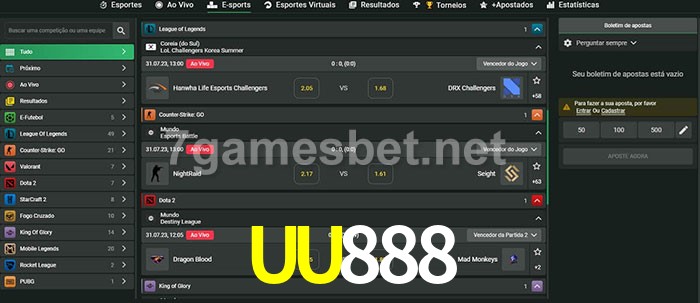 O UU888 oferece uma grande seleção de opções de apostas em e-sports com probabilidades competitivas